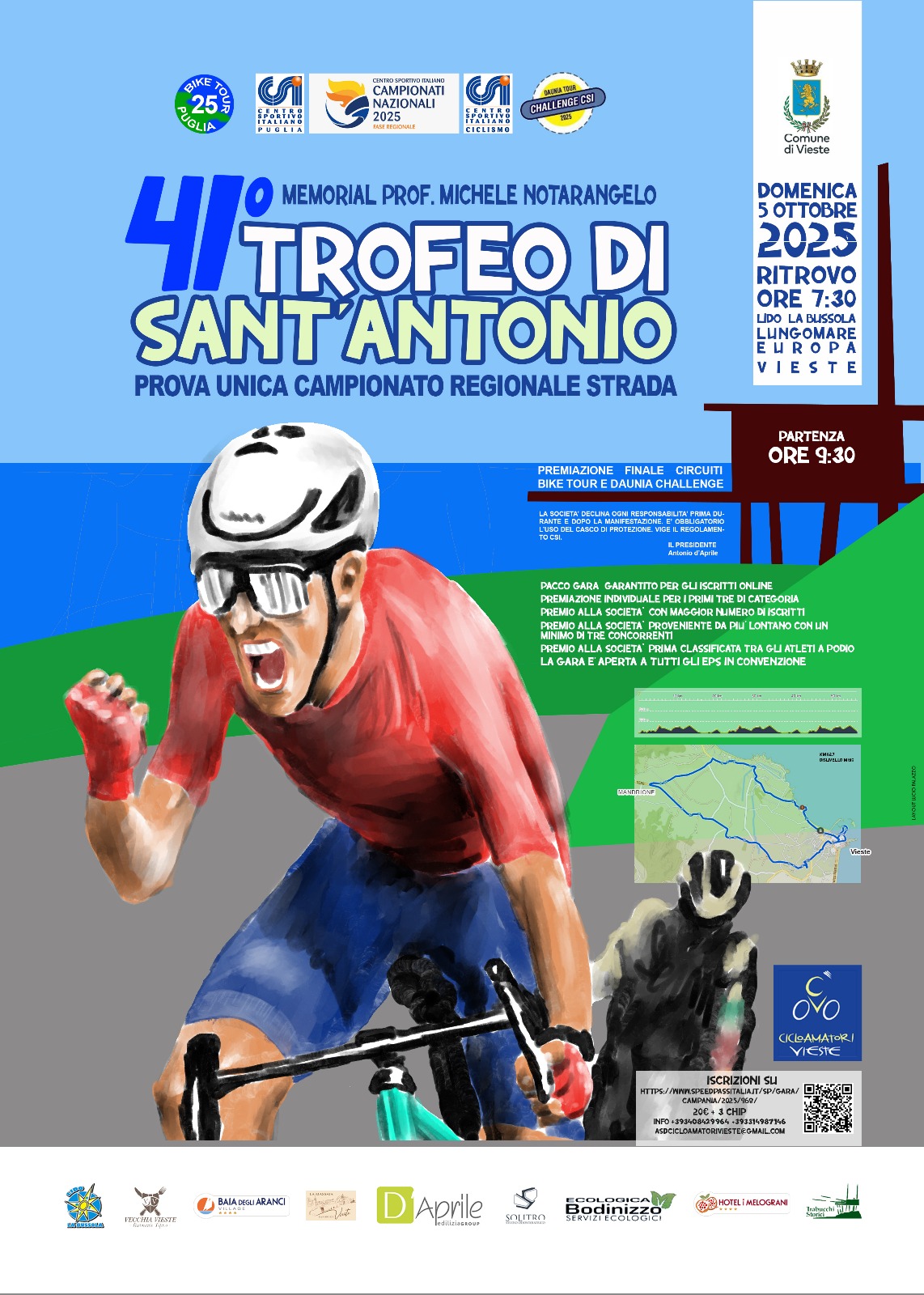 La prima frazione del giro sarà di tipo "cicloturistico" con partenza dal Lido la Bussola, proseguimento su Lungomare Europa, Via Santa Maria di Merino, Via Veneto, Corso Lorenzo Fazzini, Via Marinai d'Italia, Via Cristoforo Colombo, Via Santa Maria di Merino, Via Veneto, Viale XXIV Maggio, Via Dante Alighieri fino al Km0 in Località Pietà da dove partirà la Gara che proseguirà su SS89 proseguimento su SP52Bis e ritorno a Vieste su SP52,proseguimento su Lungomare Europa, Viale Italia, Via Puccini,Via Verdi,proseguimento su SS89,SP52Bis e ritorno a Vieste su SP52,proseguimento su Lungomare Europa, Viale Italia, Via Puccini,Via Verdi, proseguimento su SS89,SP52Bis e ritorno a Vieste su SP52,arrivo su Lungomare Europa nei pressi del Lido La Bussola.