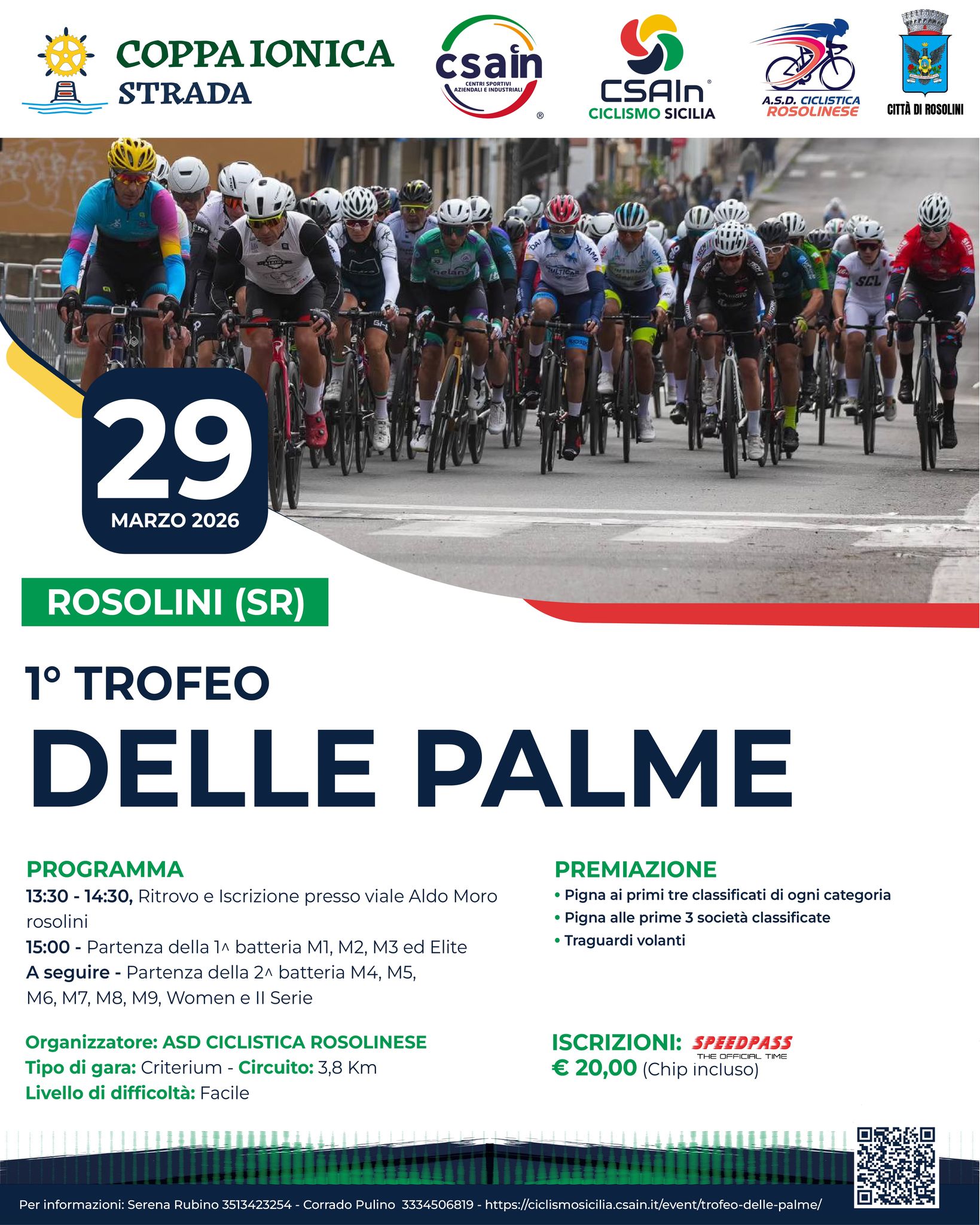 29 marzo 2026 - Rosolini (SR) Trofeo delle Palme Una gara ciclistica organizzata da ASD Ciclistica Rosolinese e patrocinata dalla Città di Siracusa e Csain - Centri Sportivi Aziendali e Industriali. Per maggiori informazioni https://ciclismosicilia.csain.it/event/trofeo-delle-palme/ Serena Rubino 3513423254 - Corrado Pulino 3334506819
